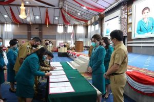 Acara selanjutnya adalah Penandatanganan Berita Acara Pelantikan dan Pengkuhan yang dipimpin oleh Ketua dan Sekretaris Penggerak PKK Kota Manado ikut disaksikan oleh Wali Kota dan Wakil wali Kota Manado.