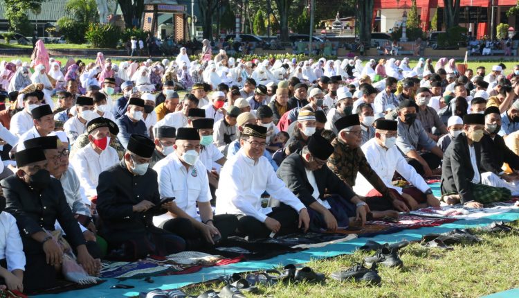 METROKAWANUA – Wali Kota Manado Andrei Angouw bersama Wakil Wali Kota dr. Richard Sualang menghadiri pelaksanaan Sholat Ied yang berlangsung di lapangan Sparta Tikala Senin pagi (02/05/2022).