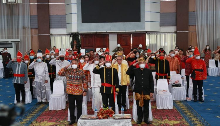 METROKAWANUA – Bertempat di Ruang Serbaguna Balai Kota Manado, Wali Kota Manado Andrei Angouw mengikuti Upacara Peringatan Hari Lahir Pancasila Tahun 2022 hari ini Rabu (01/06/2022) secara daring/online. Upacara ini diselenggarakan secara nasional dan dilaksanakan terpusat di Lapangan Pancasila Ende, Kabupaten Ende, Provinsi Nusa Tenggara Timur.