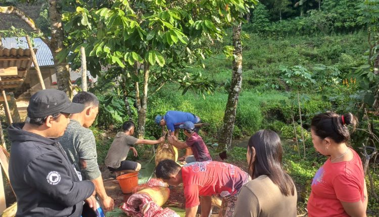 Pembagian daging babi kepada para janda, duda, dan keluarga miskin adalah upaya pemerintah desa melalui program ketahanan pangan bidang hewani.
