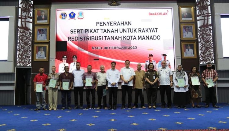 Manado, Metrokawanua – Wali Kota dan Wakil Wali Kota Manado Andrei Angouw dan Bpk. Richard Sualang menghadiri kegiatan Penyerahan Sertifikat Hak Atas Tanah Hasil Kegiatan Redistribusi Tanah di Ruang Serbaguna Kantor Wali Kota Manado, Rabu (8/2).