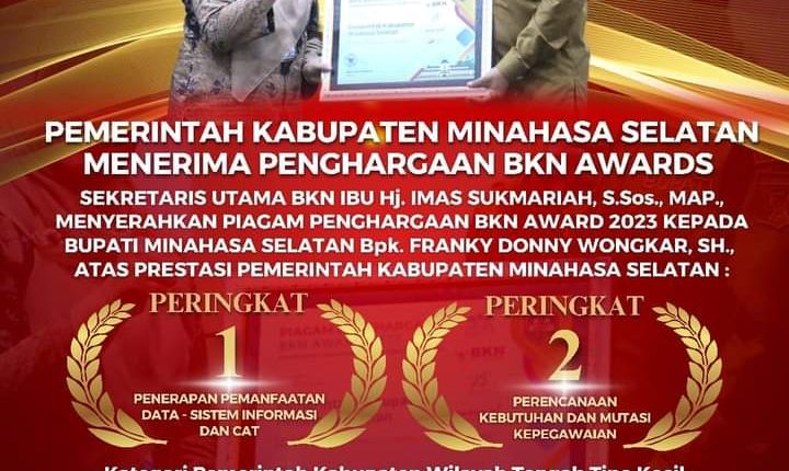Dalam kegiatan ini, Sekretaris Utama BKN menyerahkan Piagam Penghargaan BKN Award 2023 kepada Bupati Minahasa Selatan atas prestasi Pemerintah Kabupaten Minahasa Selatan sebagai Peringkat 1 atas capaian dalam Penerapan Pemanfaatan Data – Sistem Informasi dan CAT serta Peringkat 2 atas capaian dalam Perencanaan Kebutuhan dan Mutasi Kepegawaian, kedua-duanya untuk Kategori Pemerintah Kabupaten Wilayah Tengah Tipe Kecil.