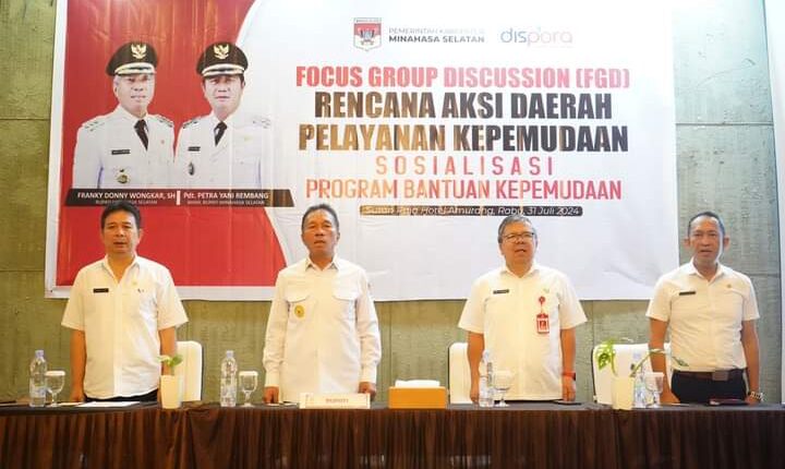Metrokawanua. Com — Matangkan Rencana Aksi Daerah Pelayanan Kepemudaan, dan Sosialisasi Program Bantuan Kepemudaan. Dinas Kepemudaan dan Olahraga Kabupaten Minahasa Selatan menggelar Focus Group Discussion (FGD). Yang dibuka oleh Bupati Franky Donni Wongkar. SH, bertempat di Hotel Sutanraja Amurang, Rabu (31/7/24)
