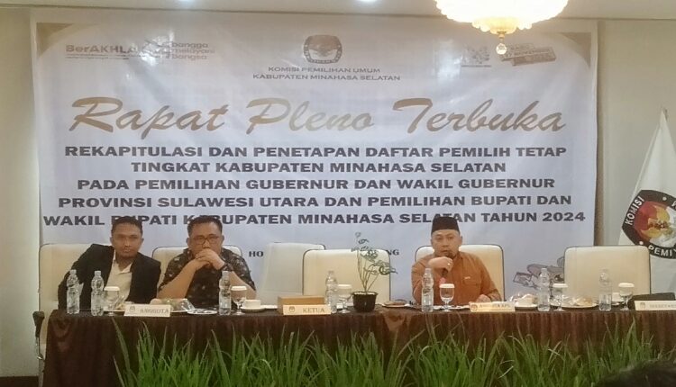 Metrokawanua. Com – Komisi Pemilihan Umum (KPU) Kabupaten Minahasa Selatan (Minsel) menggelar kegiatan Rapat Pleno Terbuka Rekapitulasi Daftar Pemilih Tetap (DPT) Pemilihan Gubernur dan Wakil Gubernur Provinsi Sulawesi Utara (Sulut) serta Bupati dan Wakil Bupati Kabupaten Minahasa Selatan (Minsel), bertempat diHotel Sutanraja Amurang, Jumat (20/09/2024).