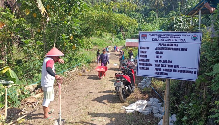 Metrokawanua. Com — Bersumber dari dana desa (Dandes) tahun 2024 Pemerintah Desa Kilo Meter Tiga Kecamatan Amurang, laksanakan pembangunan Jalan pemukiman warga serta dilokasi pekuburan desa.